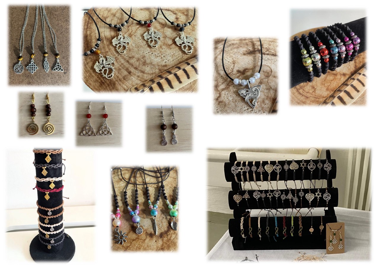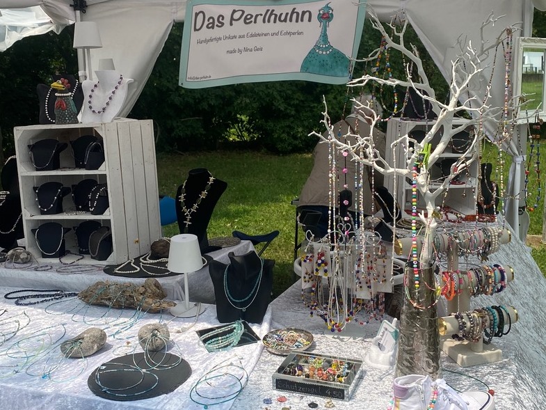 Liebevoll handgefertigter Schmuck aus Edelsteinen und Echtperlen, jedes Teil an Unikat. Handgemalte Acrylbilder, hauptsächlich abstrakte Werke auf Keilrahmen.